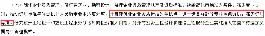 《2018年工作要點(diǎn)》中明確表示:繼續(xù)簡(jiǎn)化市場(chǎng)準(zhǔn)入條件,減少專業(yè)類別;開展建筑業(yè)企業(yè)資質(zhì)標(biāo)準(zhǔn)改革試點(diǎn),進(jìn)一步合并部分專業(yè)承包資質(zhì),減少資質(zhì)等級(jí)。